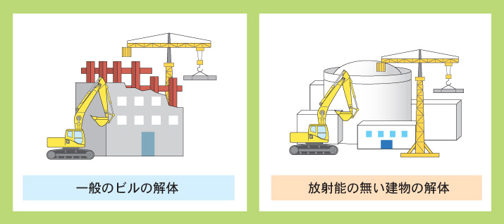 まず放射能のある物とない物に分けて放射能を取り除くんだ。 その後に放射能のない建物などは専用の機械や街にあるビルを解体するのと同じような機械を使って解体していくんだよ。